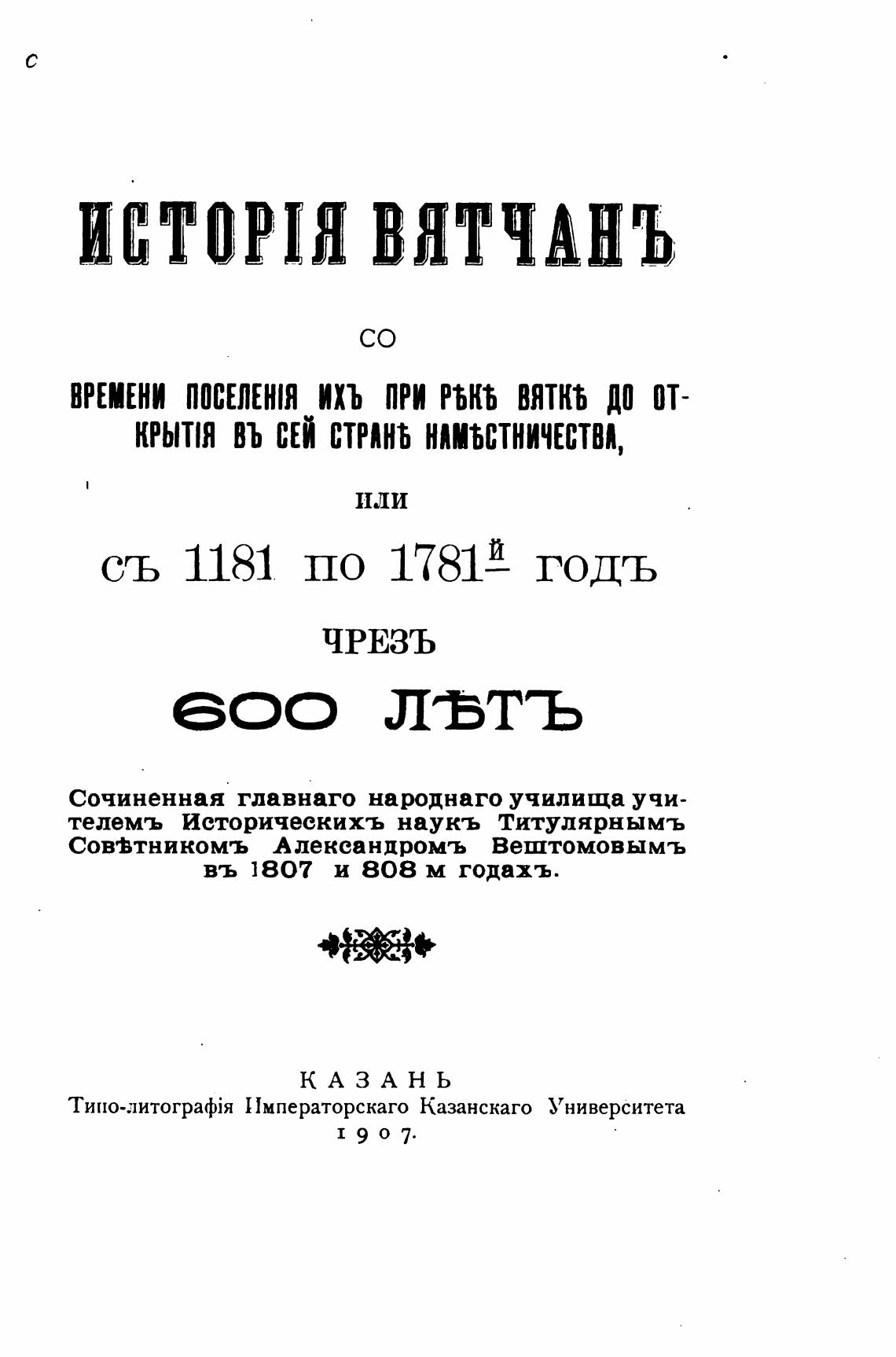 ВРЕМЕНИ ПОСЕЛЕНIЯ ИХЪ при ВЯТКЪ ДО ОТ-