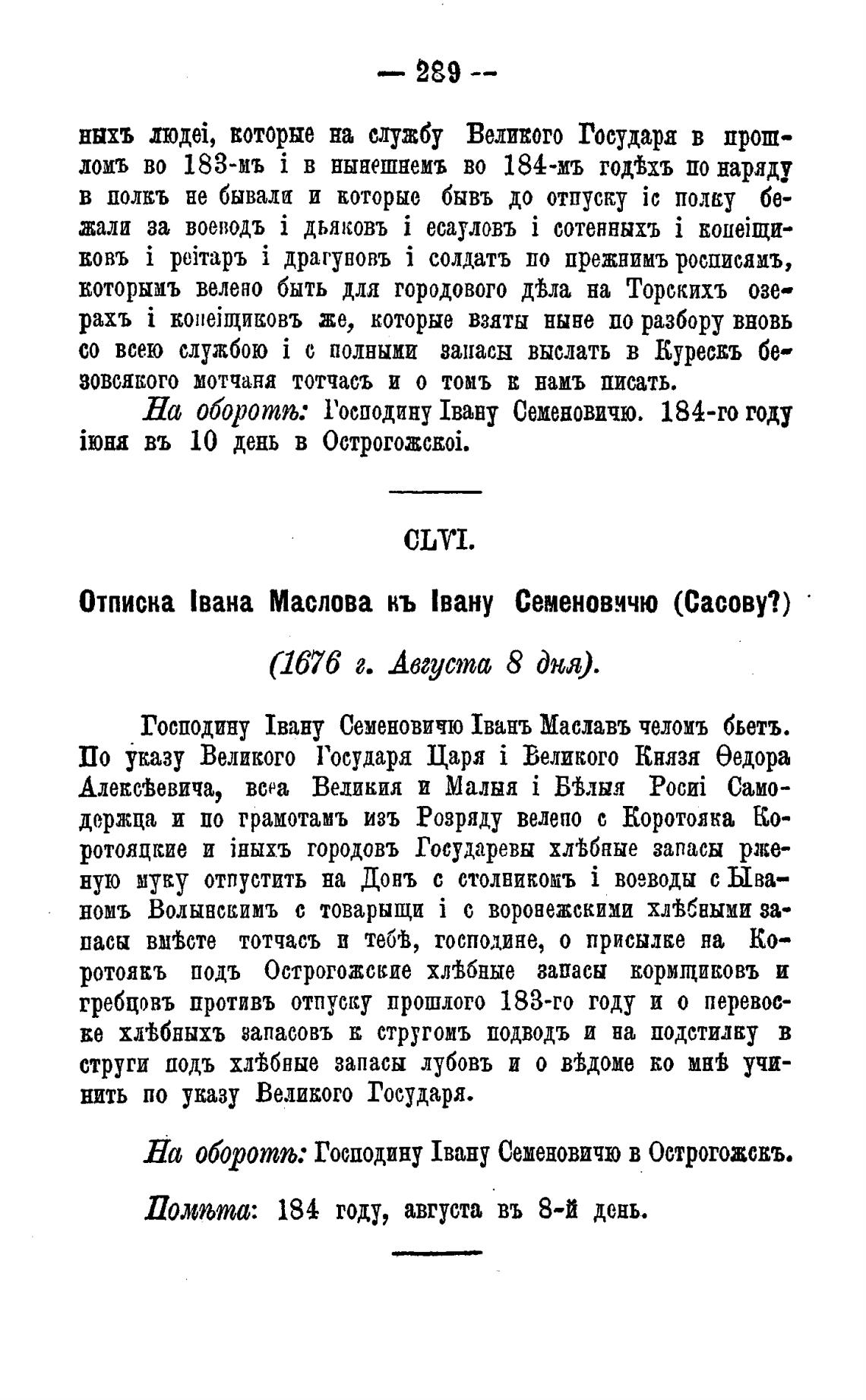 Отписка Ивана Маслова кь Евану Семеновичю (Сасову?)
