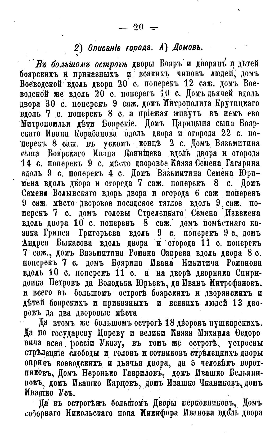 водской же вдоль 20 с. поперегъ 10 с. Домь дьячсй вдоль