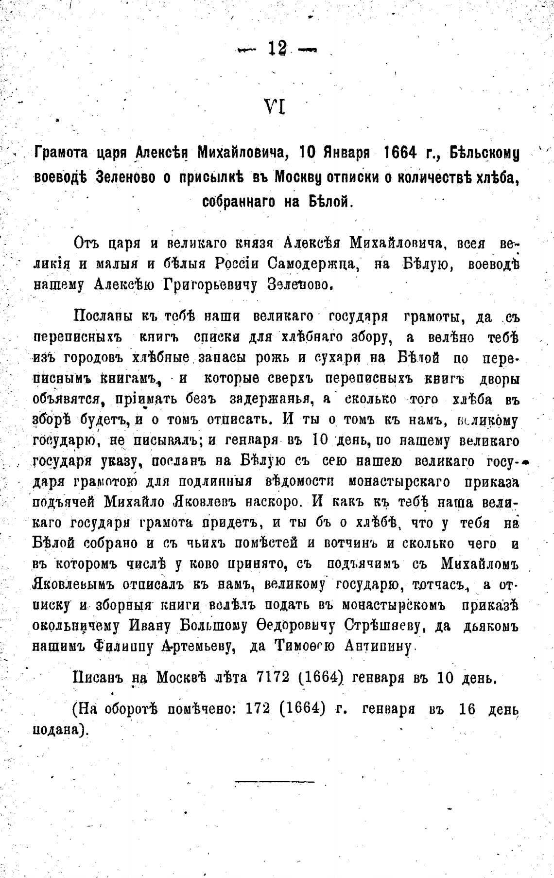 Грамота царя Алекс%я Михайловича, 10 Января 1664 г., Б%льскомд
