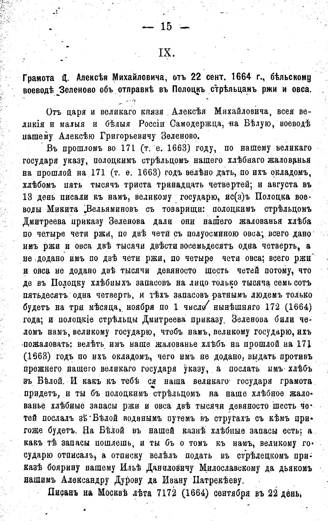 Грамота Ц. Алекс%я Михайловича, отъ 22 сент. 1664 г., б%льскомд