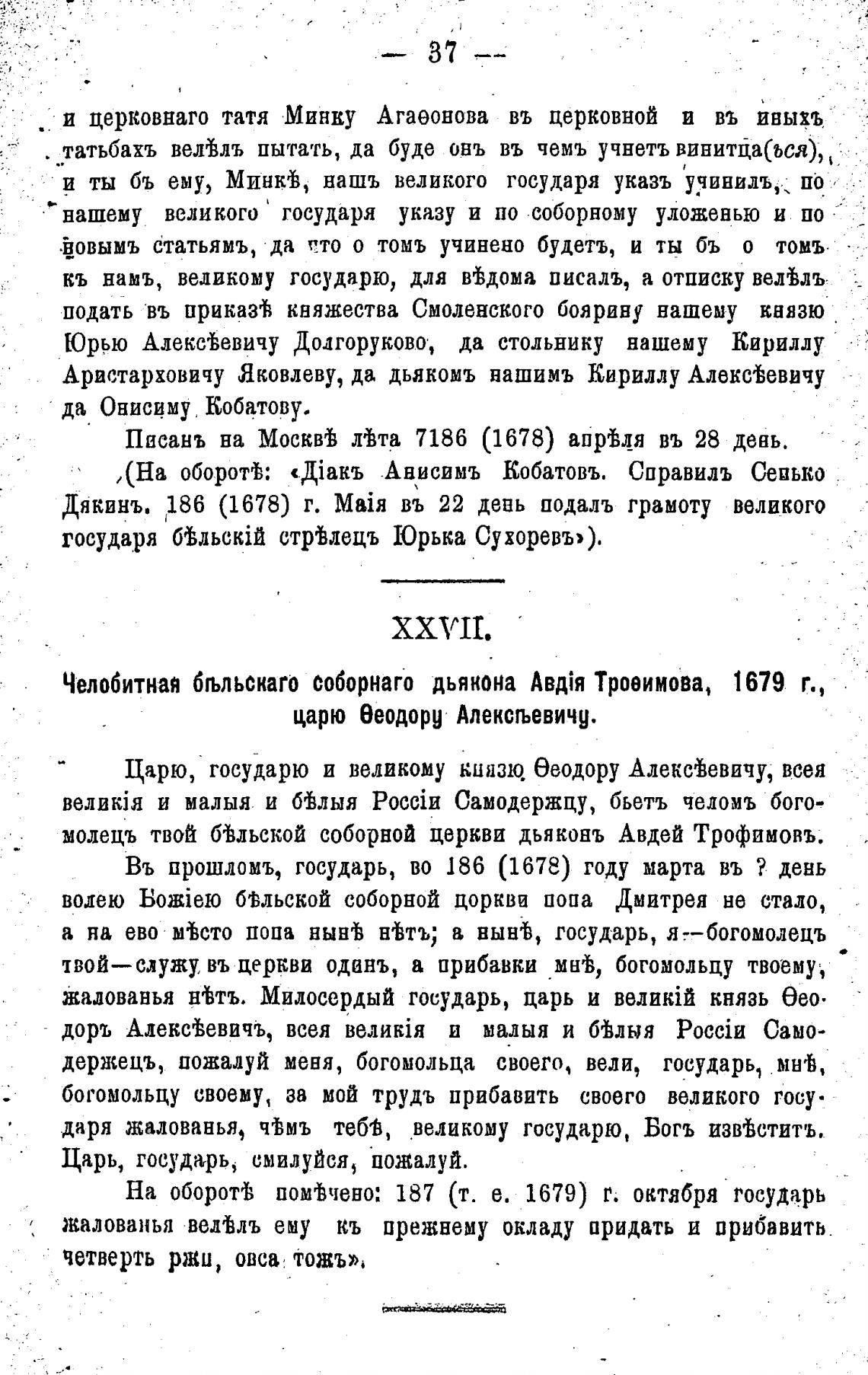 Челобитная бљльскаго соборнаго дьякона Троеимова, 1679 г.,