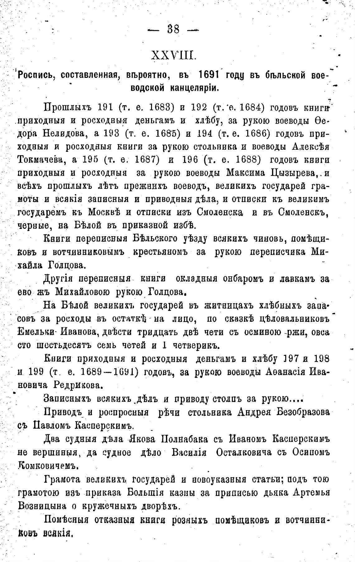 Роспись, составленная, вљроятно, въ 1691 году въ бљльской вое-