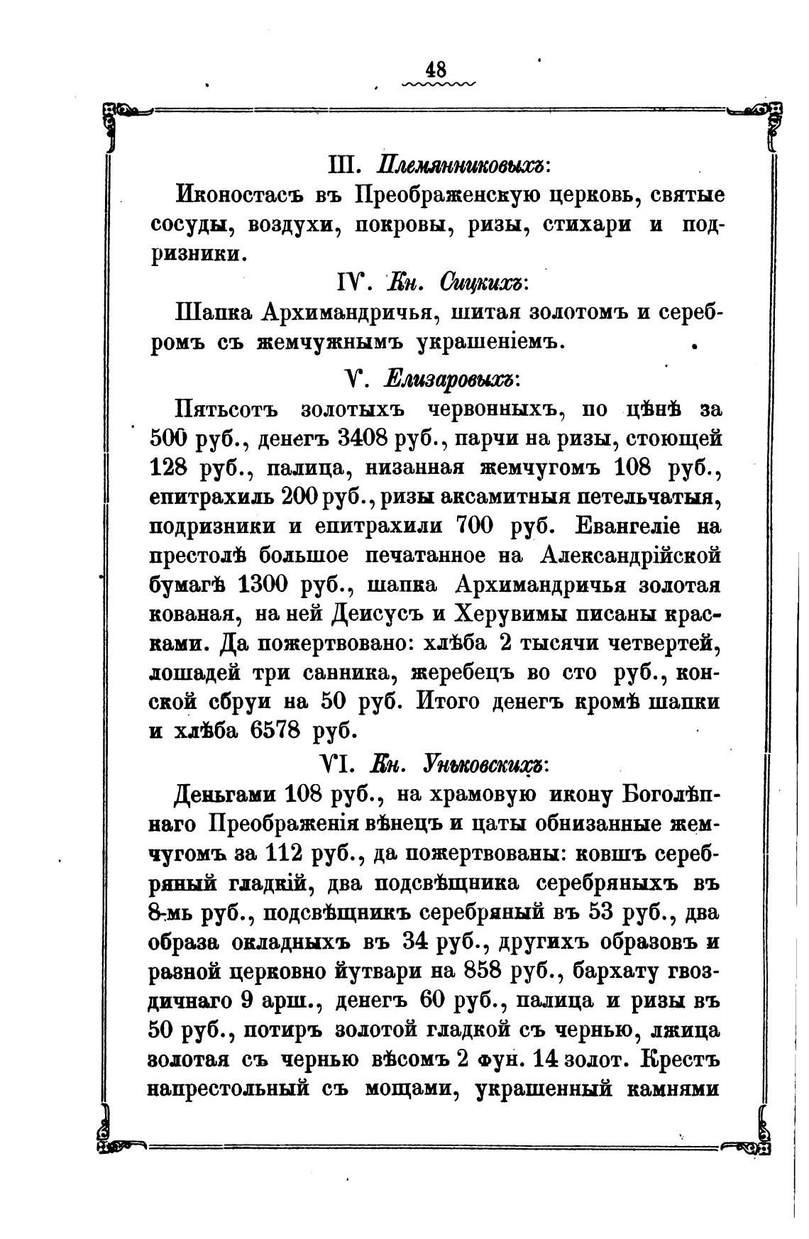 500 руб., денегъ 3408 руб., парчи на ризы, стоющей