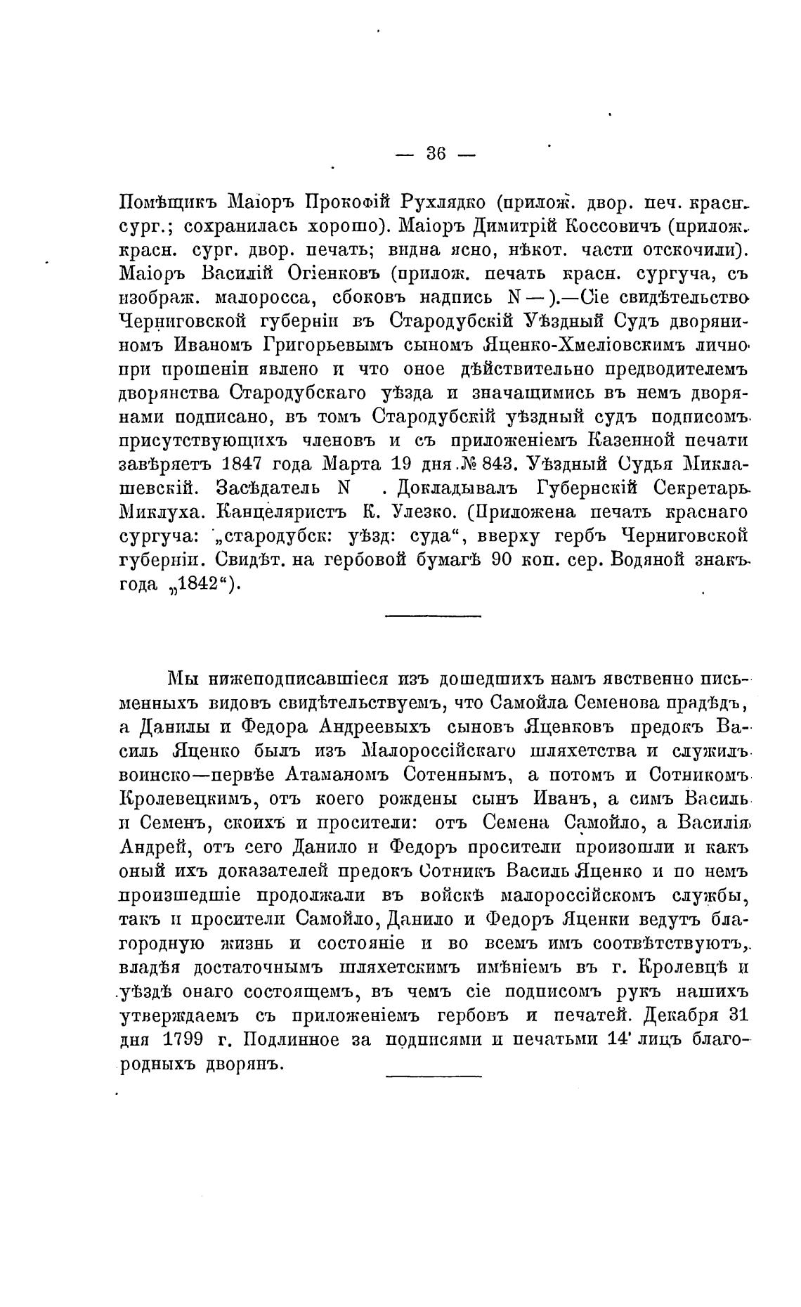 оный ихъ доказателей предокъ Сотникъ Василь Яценко и по немъ