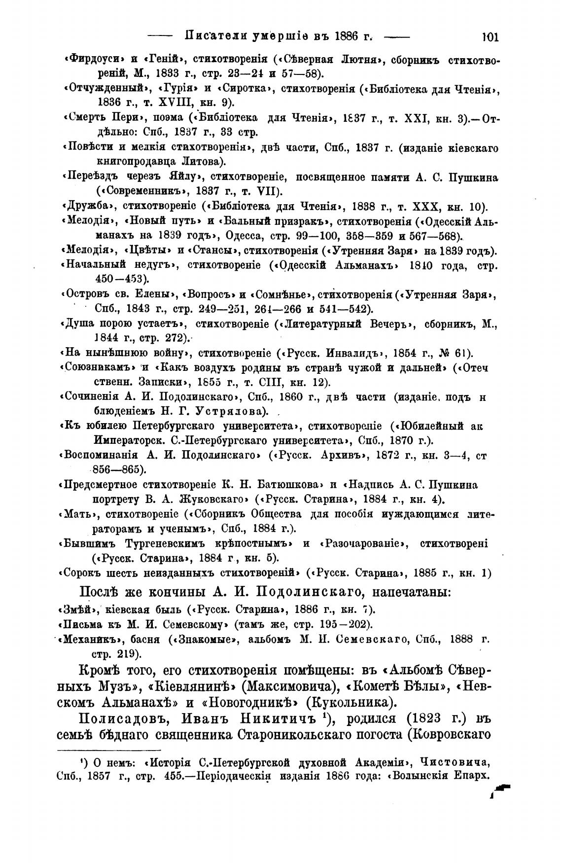 «BocnoMBHaHiH А. И. Подолинскаго» («Русск. Архивы, 1872 г., кн. 3—4, ст