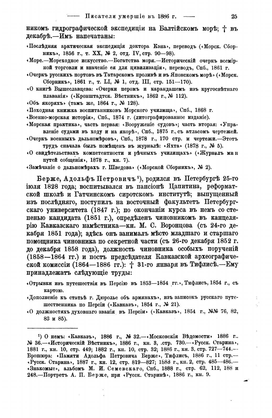 Брошюра: «Памяти Адольфа Петровича Берже», Тифлисъ, 1886 г., 11 стр.—