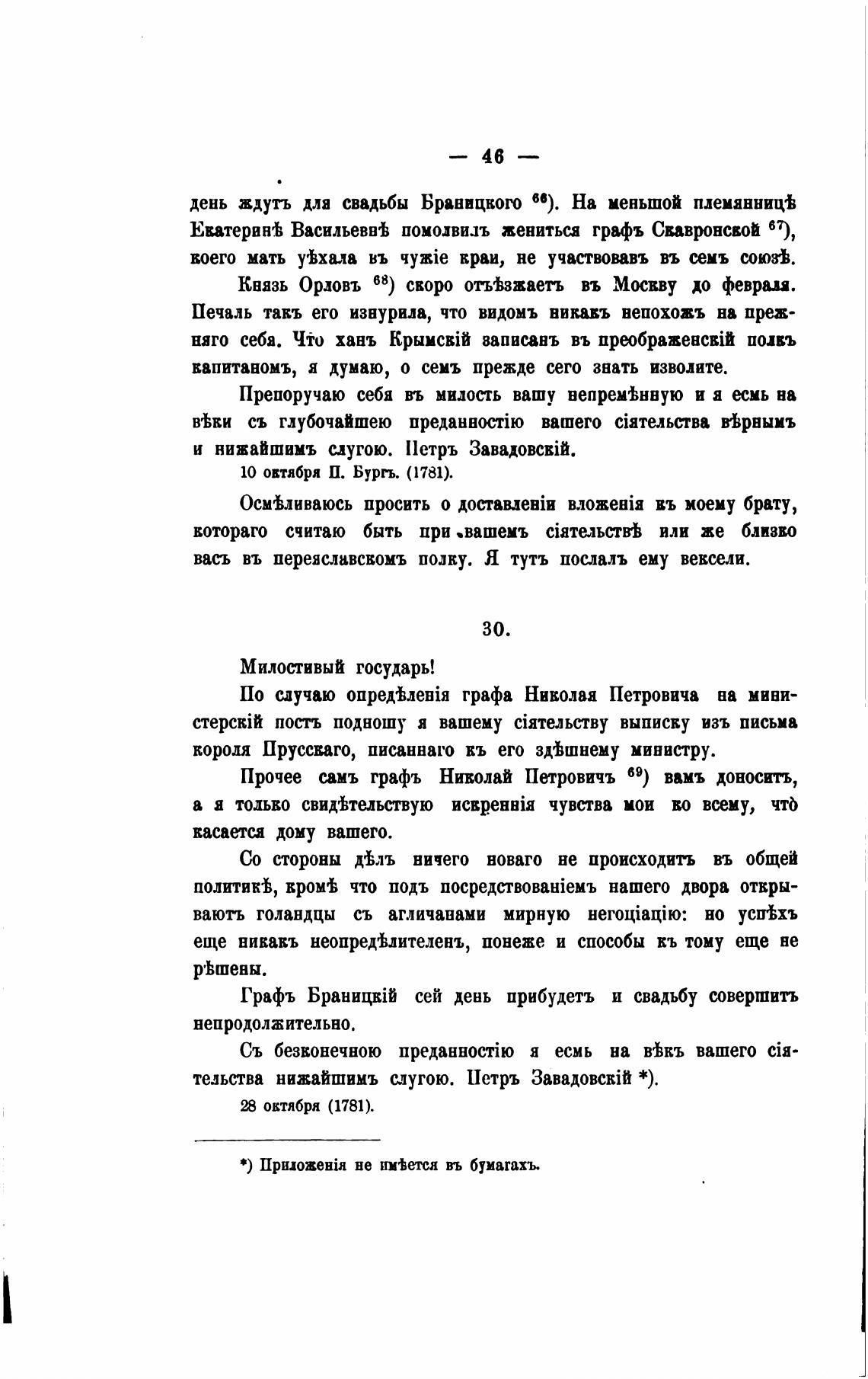 Прочее самъ графъ Ниволай Петровичъ 69) вамъ доносить,
